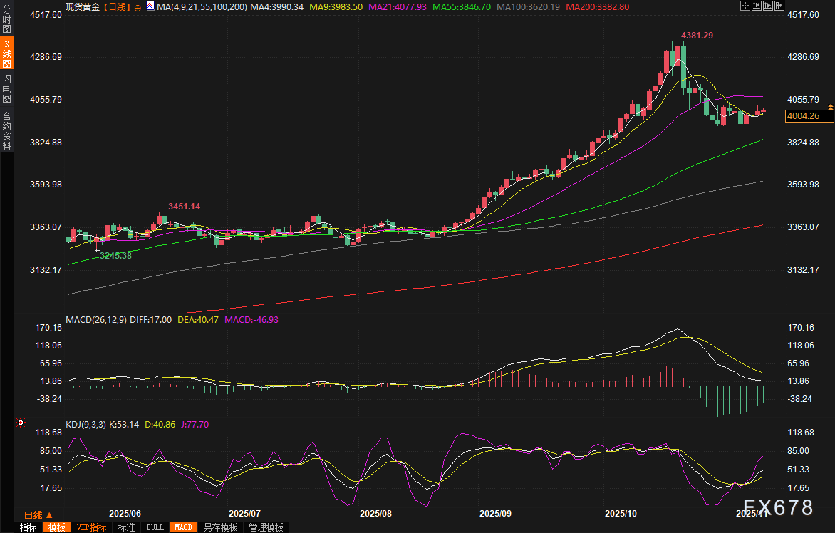 EBC官网——周一(11月10日)亚市早盘,现货黄金守住上周五涨势,一度涨至4010美元/盎司上方,较上周五收盘价4001.27美元/盎司上涨约0.2%。上周五金价上涨0.6%,成功收复4000整数关口。市场人士指出,美元指数的意外走软成为首要推手,上周五美元下跌0.15%至近一周低位,这使得以美元计价的黄金对持有其他货币的投资者而言变得更加便宜,吸引了大量海外买盘涌入。同时,美国政府关门的不确定性如阴霾般笼罩市场,显著提升了黄金的避险属性,而华尔街股指即将录得大幅周度跌幅,进一步放大了这一效应。科技股为主的纳斯达克指数上周五录得七个月来最大单周跌幅,投资者对人工智能股票涨势可持续性的担忧情绪升温,推动资金从风险资产重新转向黄金这一传统避险天堂。
