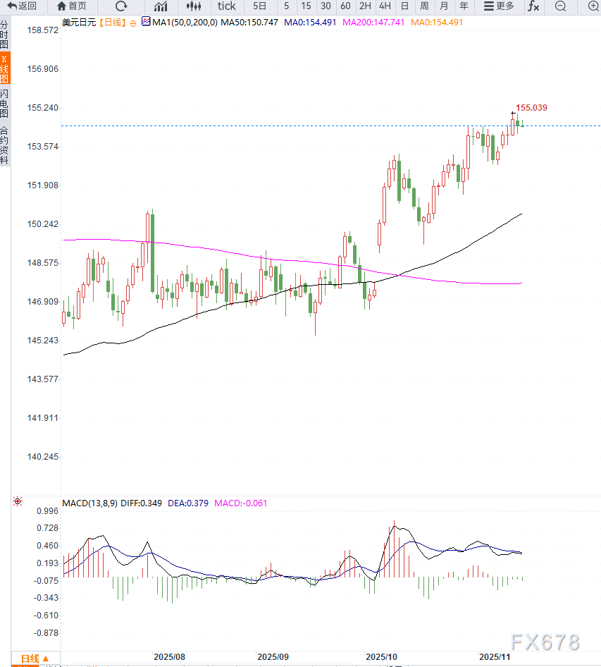 若价格有效突破155.00心理关口,则可能上探155.60,并进一步指向156.00整数关。